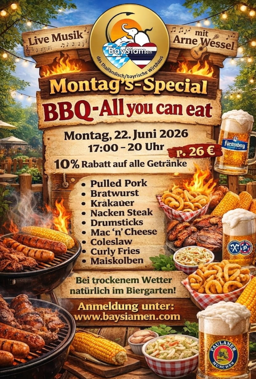 Montag's-Special BBQ–All you can eat 🍖 & Live Musik & 10% Getränkerabatt