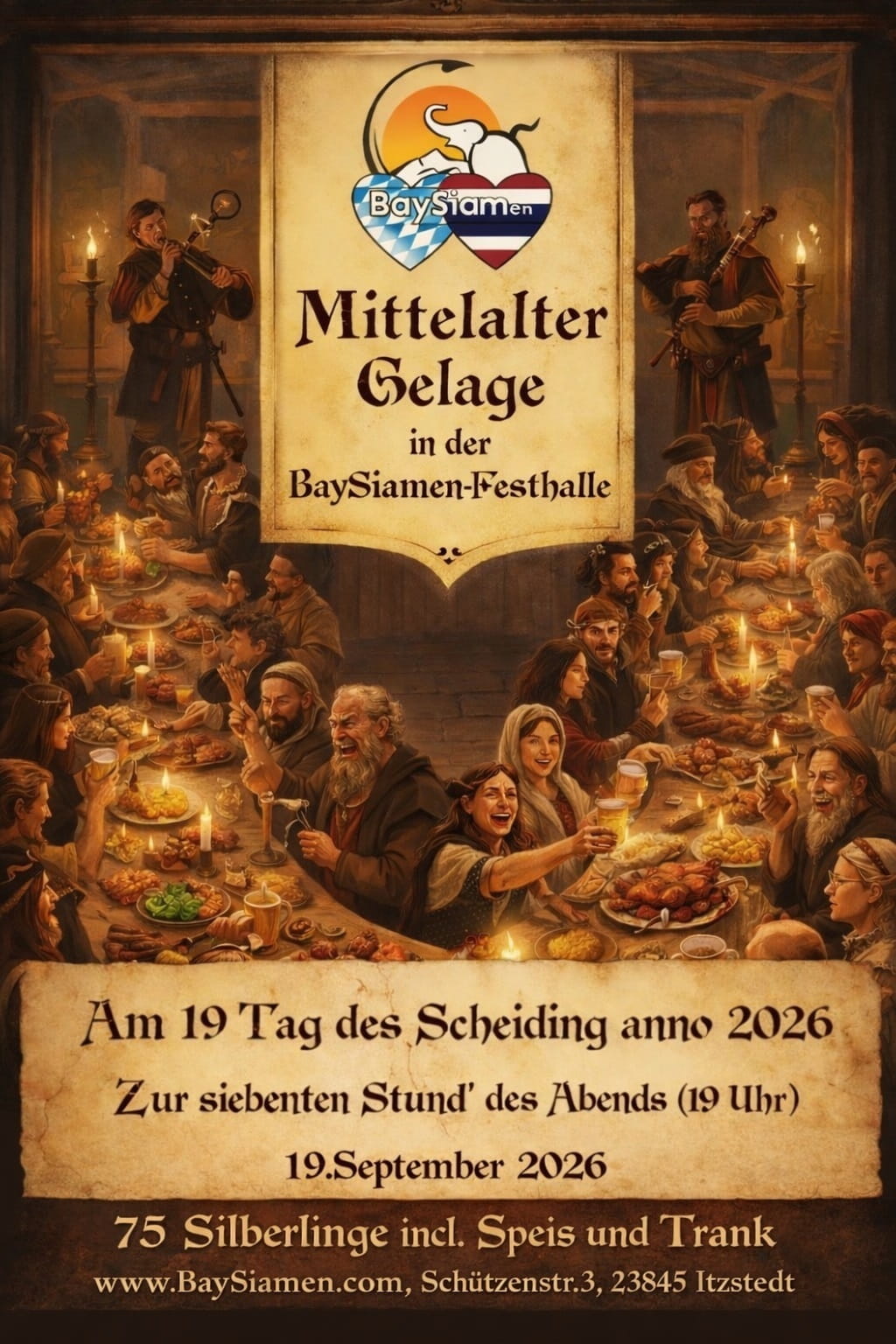 Findet Euch ein am 19. Tag des Scheiding anno 2026 (19. September). Wenn die Glocke zur siebenten Stund’ des Abends schlägt, öffnen sich die Pforten unserer Festhalle für ein Spektakel sondergleichen.