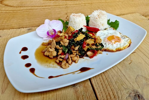 Pad Kra Pao wird mit thailändischem Jasminreis serviert.