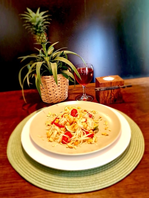 Ihr findet auf unserer Speisekarte z. B. den beliebten Salat aus grüner Papaya (Som Tam) und Laab Gai ein Gericht aus würzigem Hackfleisch,das von Hand gehackt und nicht durch den Fleischwolf gedreht wird.